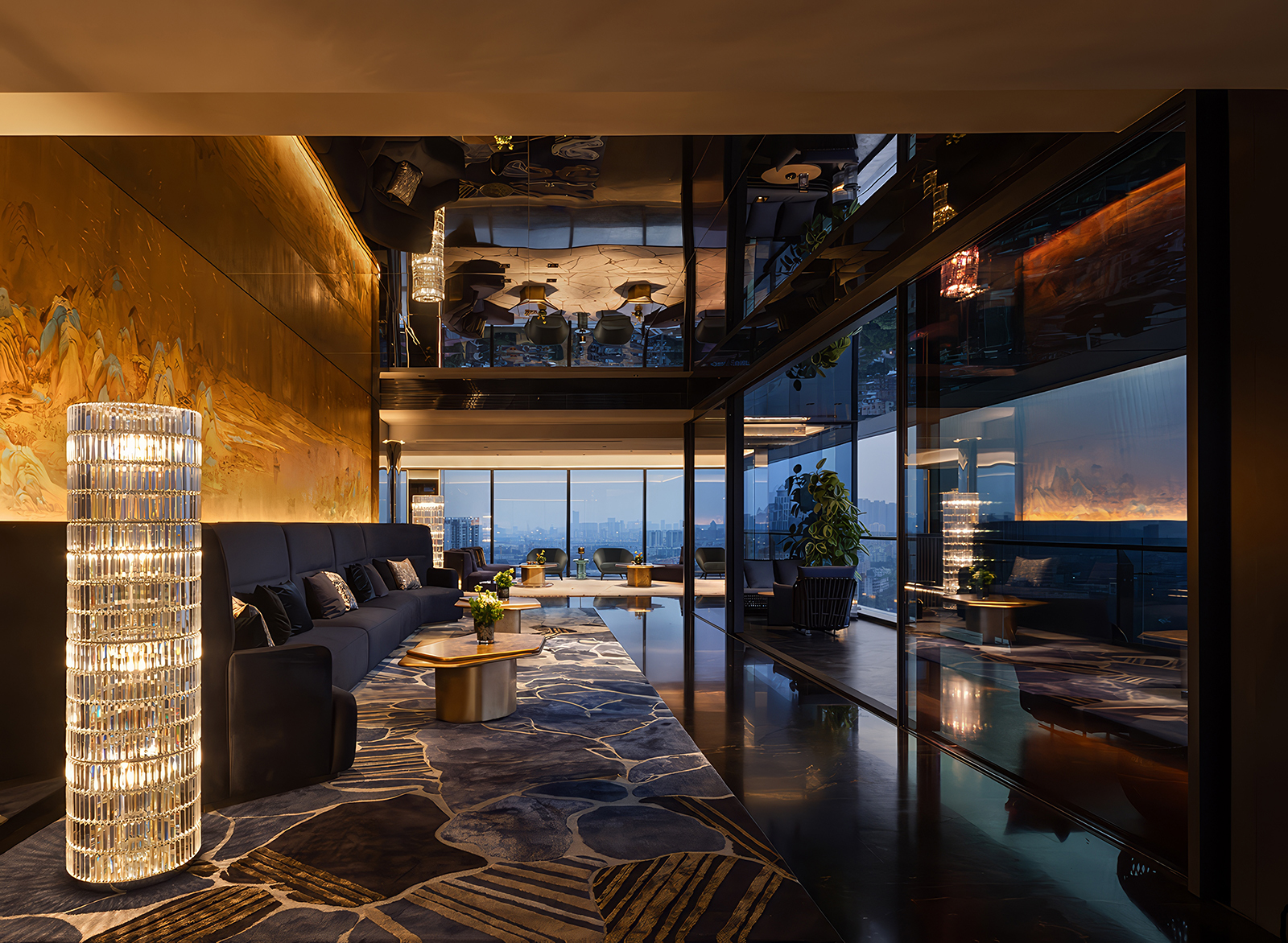 踏入梯廳,紋理鮮明的透光天然石在燈光暈染下,流淌出幽邃的明暗遞進。鎏金光暈與藍調氣息交織,與寶格麗黑石地面形成材質對話,於虛實消長間勾勒高空藝境的奢雅氛圍。轉角接待區,由 SLL 團隊與工匠聯袂創作的金箔巨作磅礴而立,靈感源自《廣州 港全景圖》,運用鏨刻與手工彩繪工藝重現珠江商貿盛景。鎏金質感順沿天花延伸,展現軒昂氣度,將歷史文脈與當代設計自然銜接。多處立面嵌入黑色鏡面與燈條,吧檯以波浪格柵設計延續牆面語彙,弧形絨布沙發環抱城市景致,形塑層次分明的空間表情。