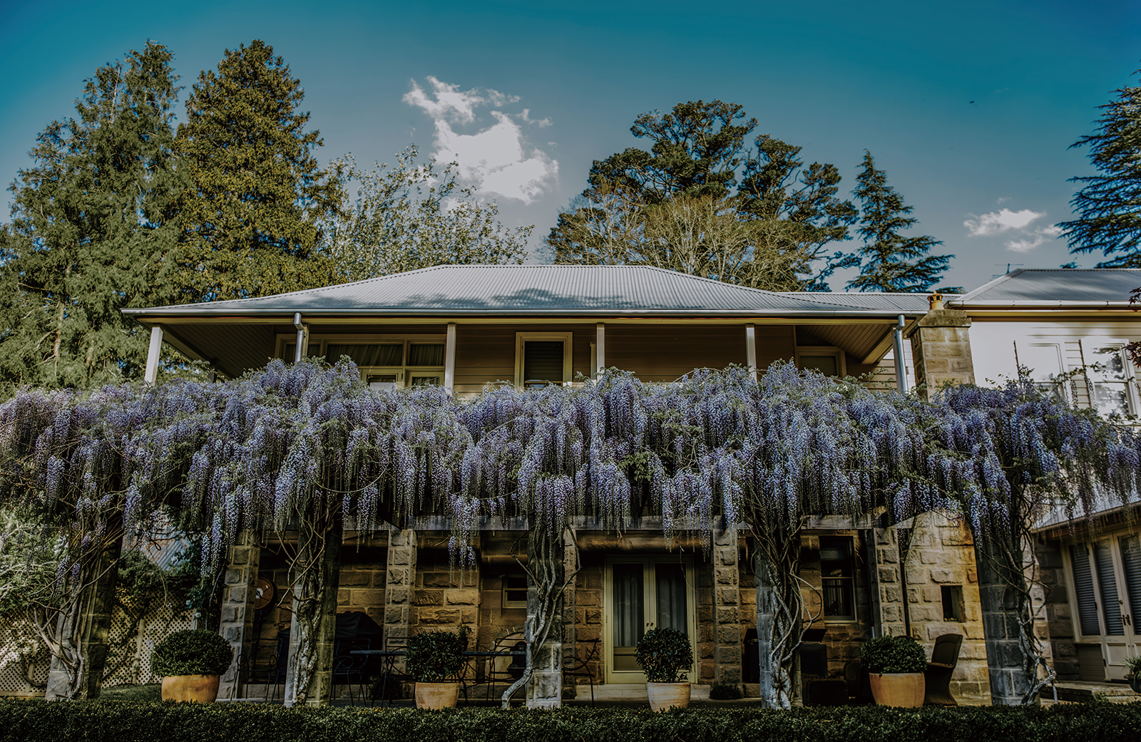 丹納克主屋以當地特有的砂岩砌築, 厚實結構彰顯精妙工藝,更因其溫潤成 色及細膩質感,形成抵禦藍山地帶濕冷 氣候的天然屏障。室內優雅延續百年歷 史印記,原始壁爐的磚石紋理、裸露的 橡木橫樑,以及精選古董家具,共同勾 勒出歷久彌新的典雅氛圍。落地玻璃窗 和門扉巧妙連結室內外,引鄰園四季美 景納入視野;晨昏光影交織流轉,為場 域鋪陳出一層詩意盎然的匠藝境語。