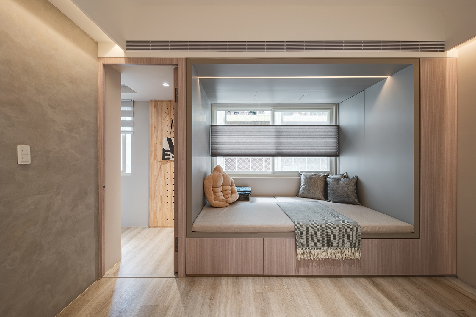 •入口整合:實木洞洞板嵌入立面,整合吊掛與收納功能,延續侘寂風的質樸語彙。